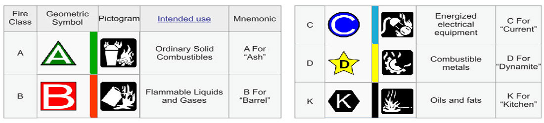 The types of fires and additional standards are described in NFPA 10: Standard for Portable Fire Extinguishers, 2013 edition.